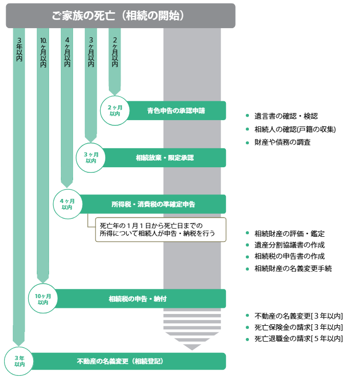 相続手続きには預金の払い戻しや不動産の名義変更、遺産分割協議や相続税申告など多岐にわたる作業があり、中には期限が設定されている手続きもあります。