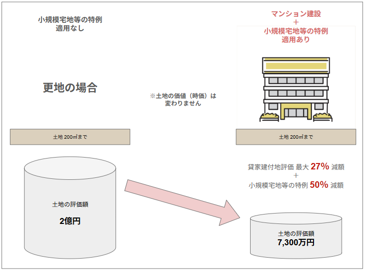例えば、2億円の土地にマンションを建設することで、更地よりも1.8億円~1.5億円程度に評価額が下がる可能性があります。