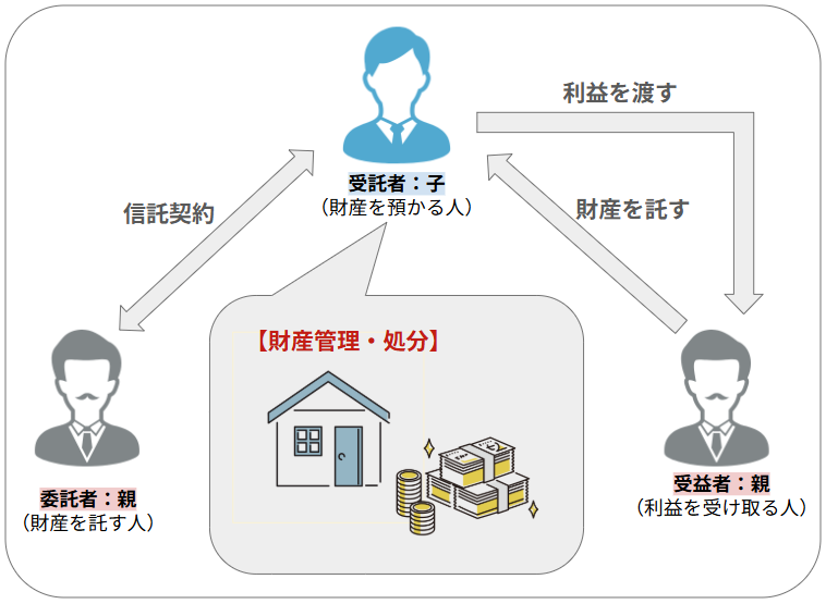財産の「所有権」自体は管理者である家族に移りますが、そこから得られる「利益」は、財産を託した人や指定された家族が受け取ります。